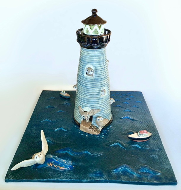 フクロウが窓から顔を出したり、灯台のまわりを飛んでいます。