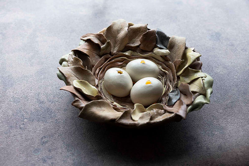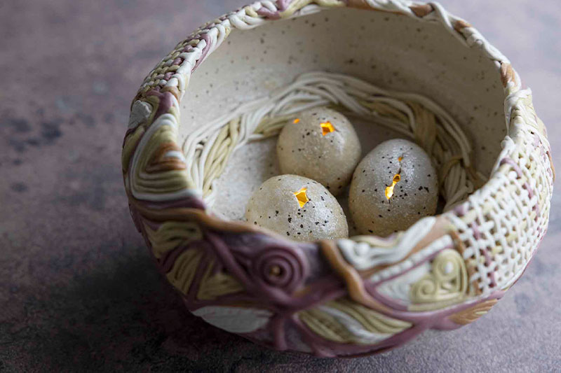 卵からヒナが大空へ逞しく巣立てるように!「色んな葉っぱで出来た巣」「編み込み柄に5羽の鳥が潜んでる巣」「木の幹にある巣」三部作。